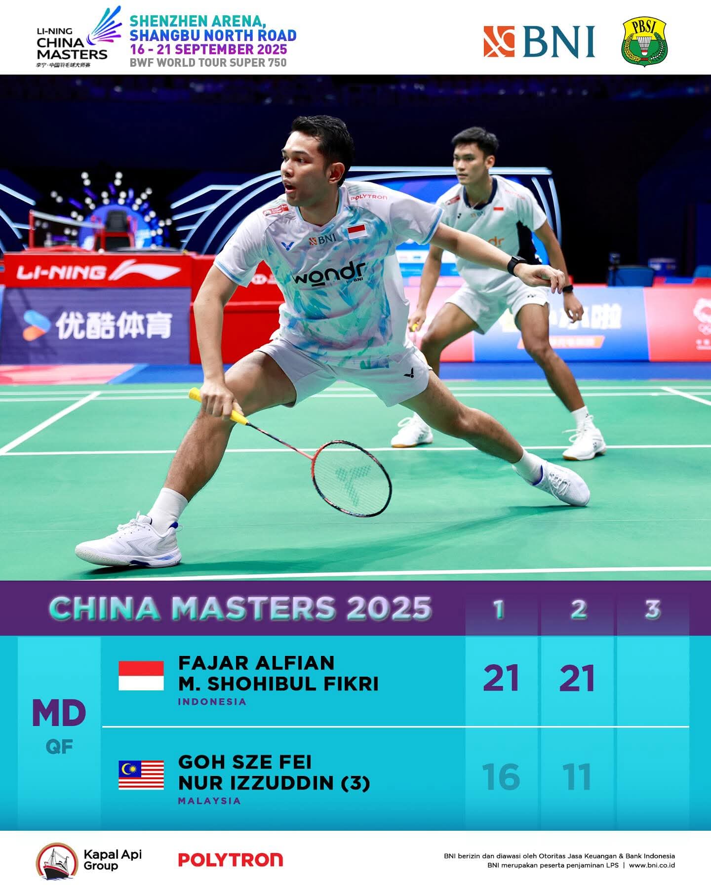 Pulangkan Unggulan 3, Fajar/Fikri Kunci Tiket Semifinal China Master 2025