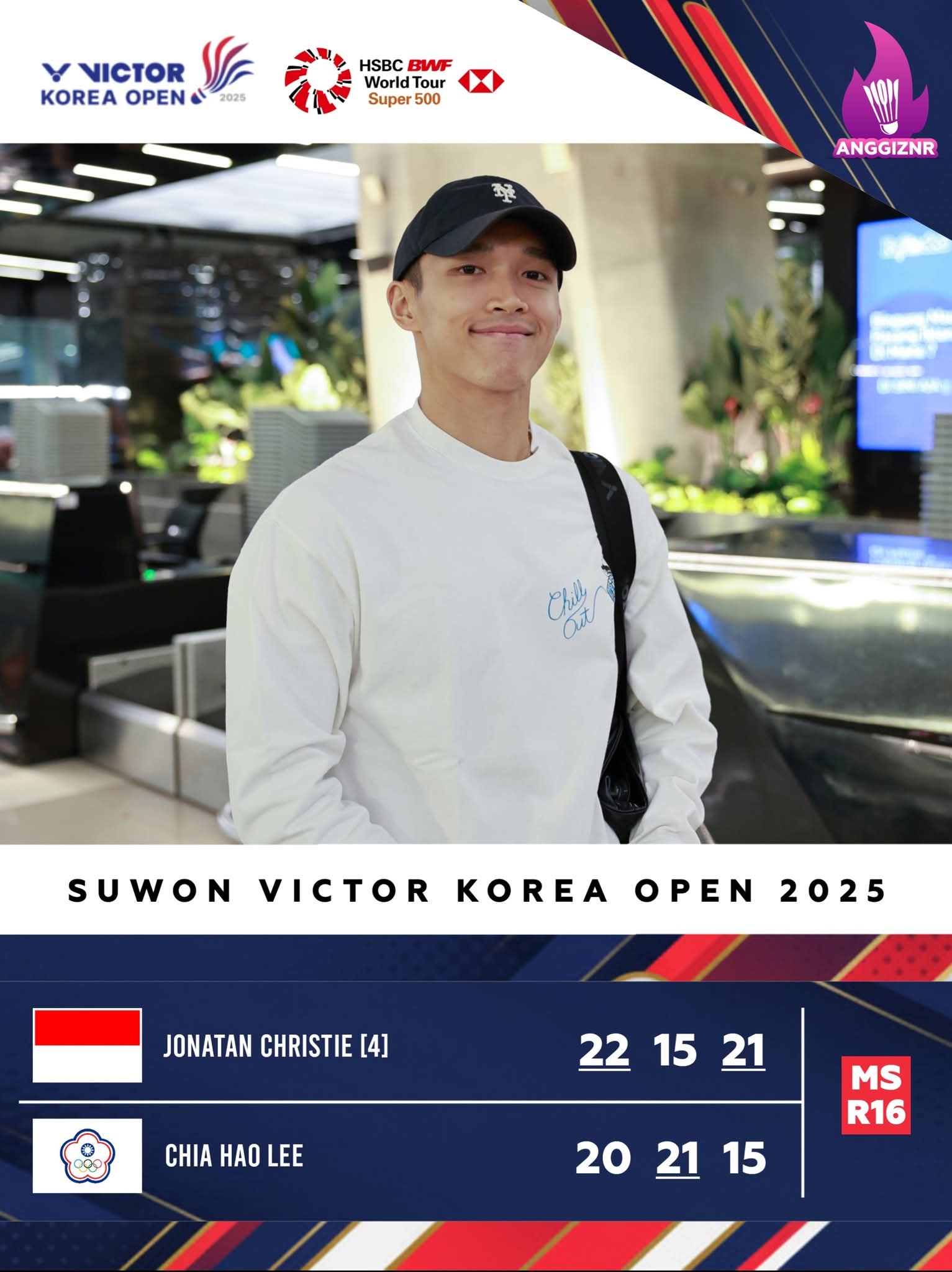 Lalu sektor tunggal putra Indonesia lainnya Jonathan Christie (Jojo) harus dengan pertaru sengit dan tajam melalui drama rubber game (tiga game/tiga set) menghadapi wakil tunggal putra terbaik Chines Taipe (Taiwan) Lee Chia Hao yakni di set pertama Jonathan alias Jojo mampu meredam wakil Chines Taipe (Taiwan) ini dengan skor ketat 22-20 untuk kemenangan set pertama Jonathan.