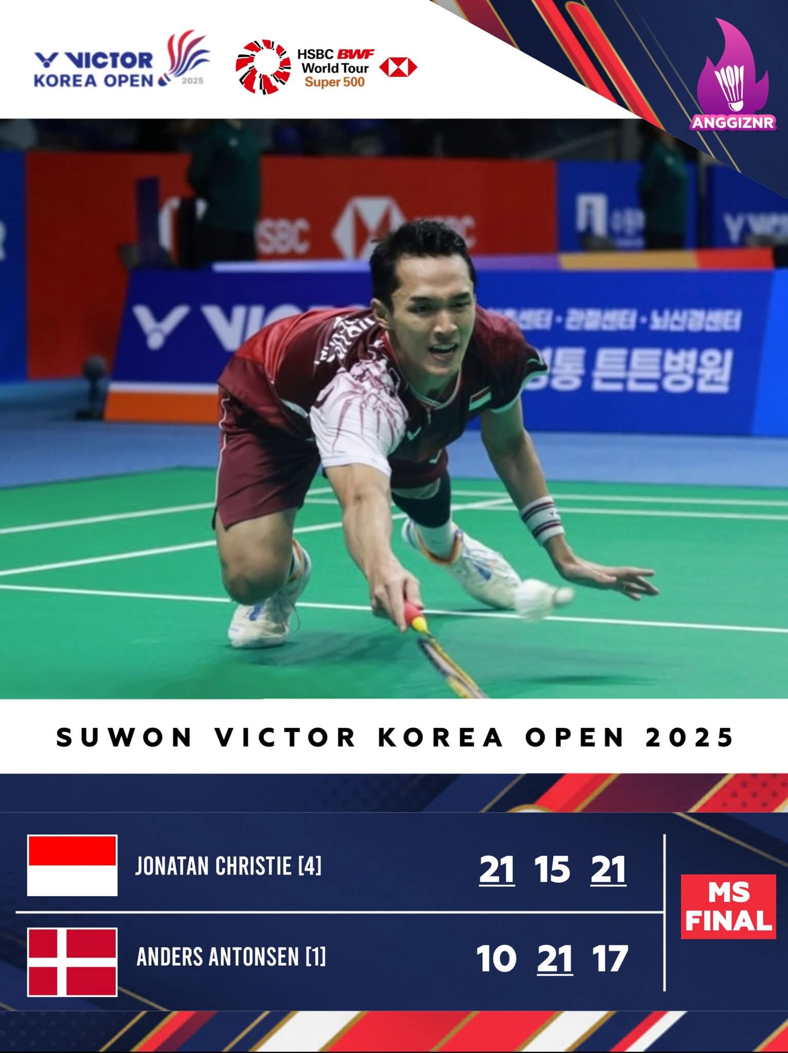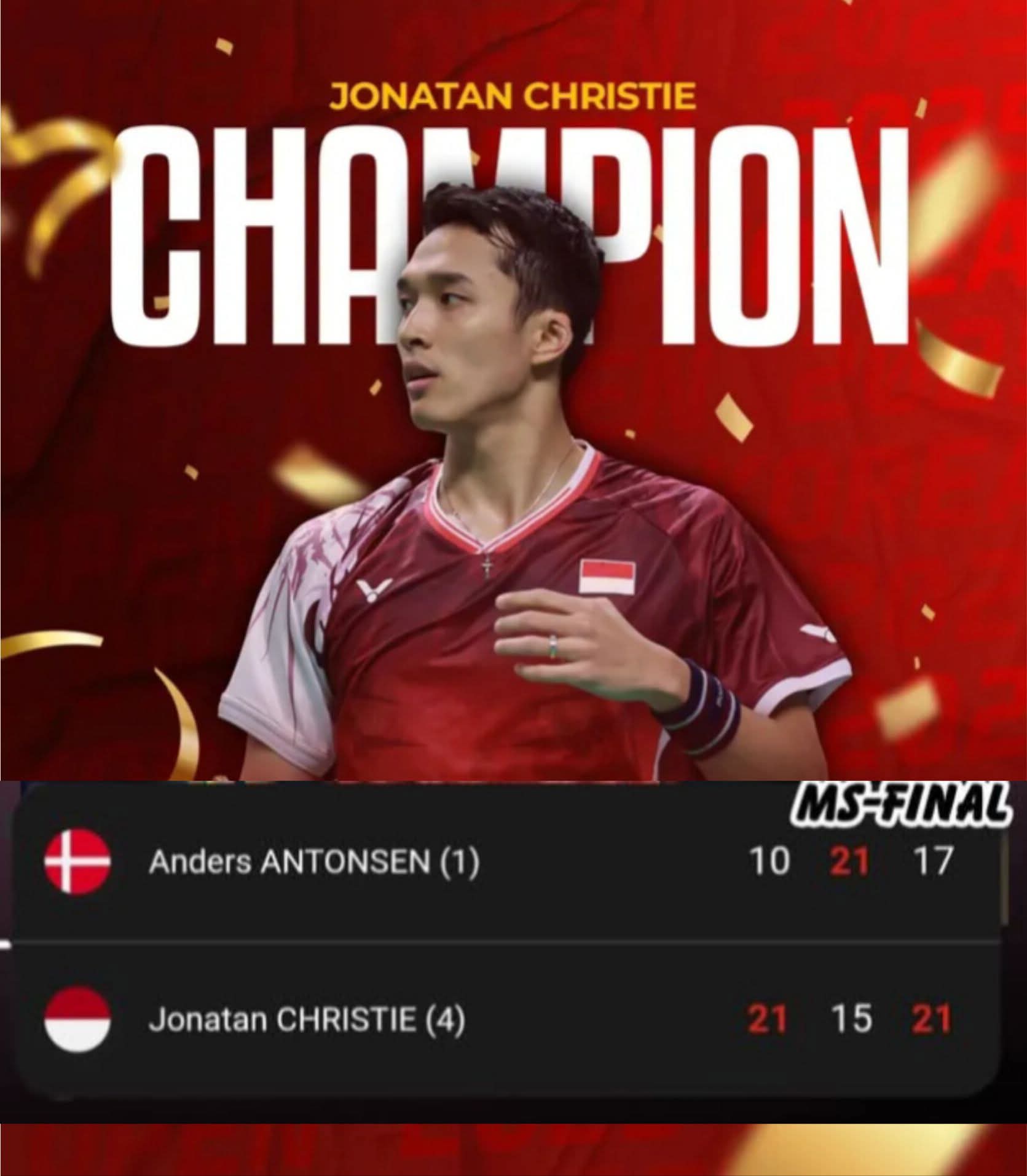 Di arena pertandingan badminton Internasional Super 500 Korea Open 2025 laga pamungkas (final) hari ini Minggu (28/9/2025), laga sengit dan tajam berdurasi lebih kurang 1 ½ jam ini akhirnya berhasil di menangkan oleh Jonathan Christie.
