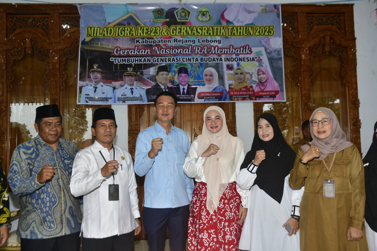 Rejang Lebong, siberkreatif.com – Bupati Rejang Lebong, H.M. Fikri Thobari, S.E., M.A.P, bersama Bunda PAUD Intan Larasita Fikri, Senin pagi (06/10/2025), menghadiri perayaan Milad Ikatan Guru Raudhatul Athfal (IGRA) ke-23 yang dirangkaikan dengan Gerakan Nasional RA Membatik atau Gernasratik. Kegiatan ini digelar Pendopo Pat Petulai, rumah dinas Bupati