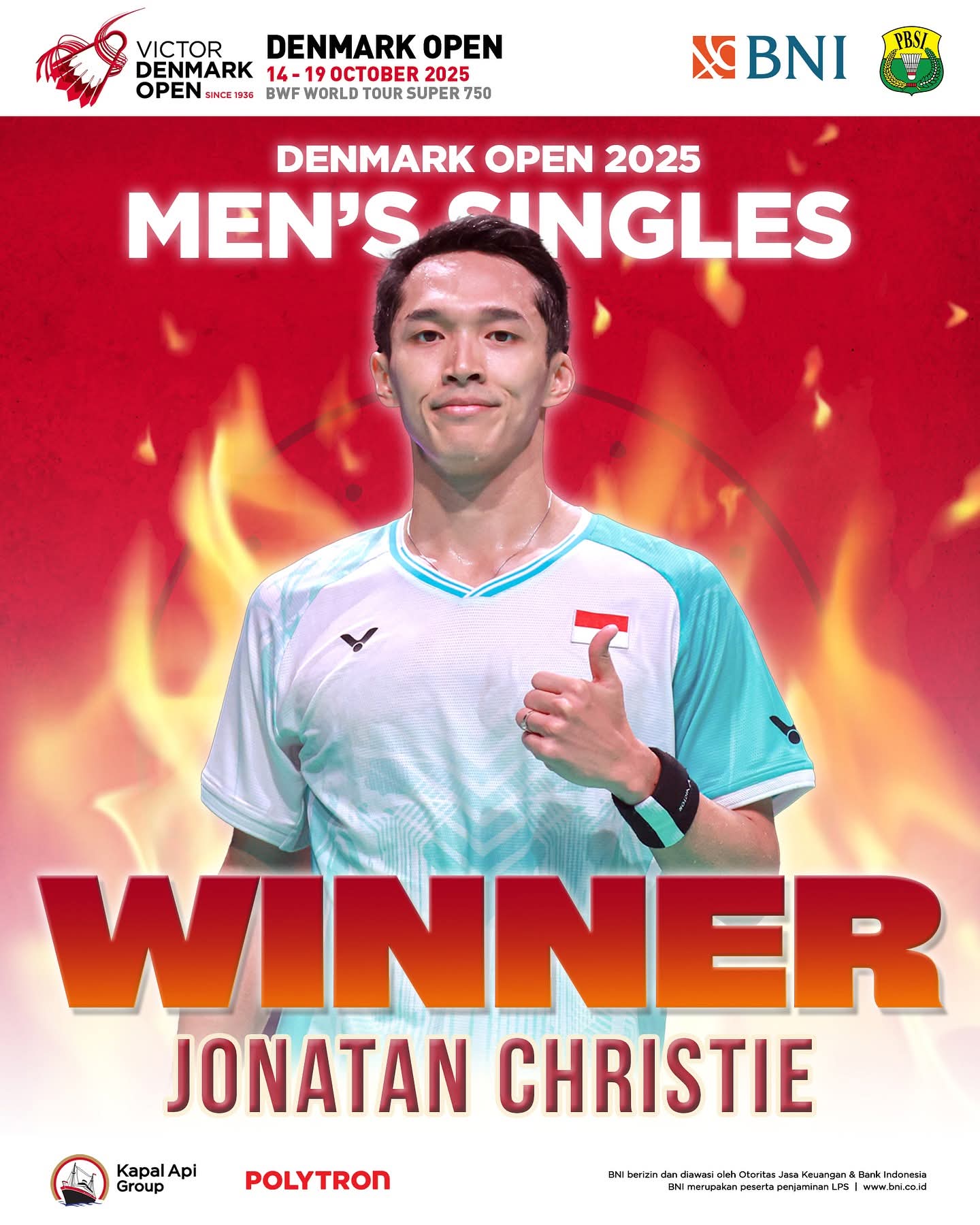 “Hasil positif atas perolehan gelar Juara Denmark Open Super 750 tahun 2025 ini membuat kepercayaan diri sang Jonathan Christie alias Jojo mampu menunjukkan ke publik Indonesia Raya bahwa dirinya walau telah berada di luar Pelatnas (pemain profesional) tetap mampu memberikan terbaik untuk bangsa Indonesia dengan berhasil meraih gelar Juara di kejuaraan Denmark Open Super 750 tahun 2025.