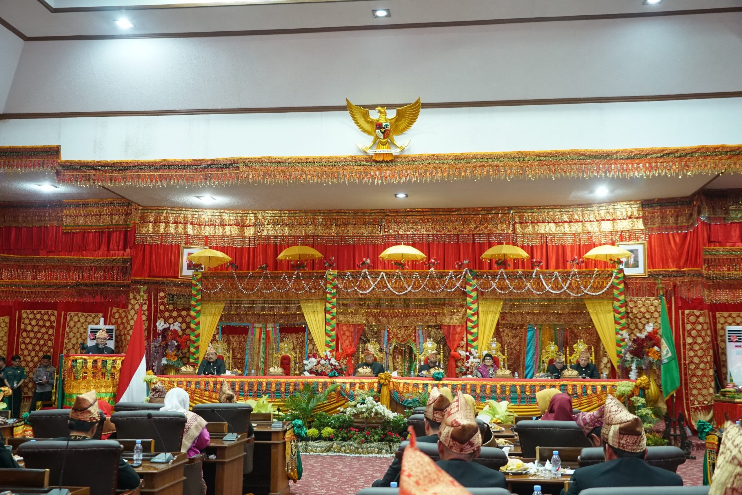 Bengkulu, siberkreatif.com – Rapat Paripurna dalam rangka Hari Ulang Tahun (HUT) ke-57 Provinsi Bengkulu digelar di Gedung DPRD Provinsi Bengkulu, Selasa (18/11) pagi. Gubernur Bengkulu Helmi Hasan hadir mengenakan pakaian adat Bengkulu bersama istrinya, Khairunnisa. Keduanya tiba di kantor DPRD dengan menggunakan delman, didampingi Wakil Gubernur Mian beserta istri, Eko Kurnia Ningsih.