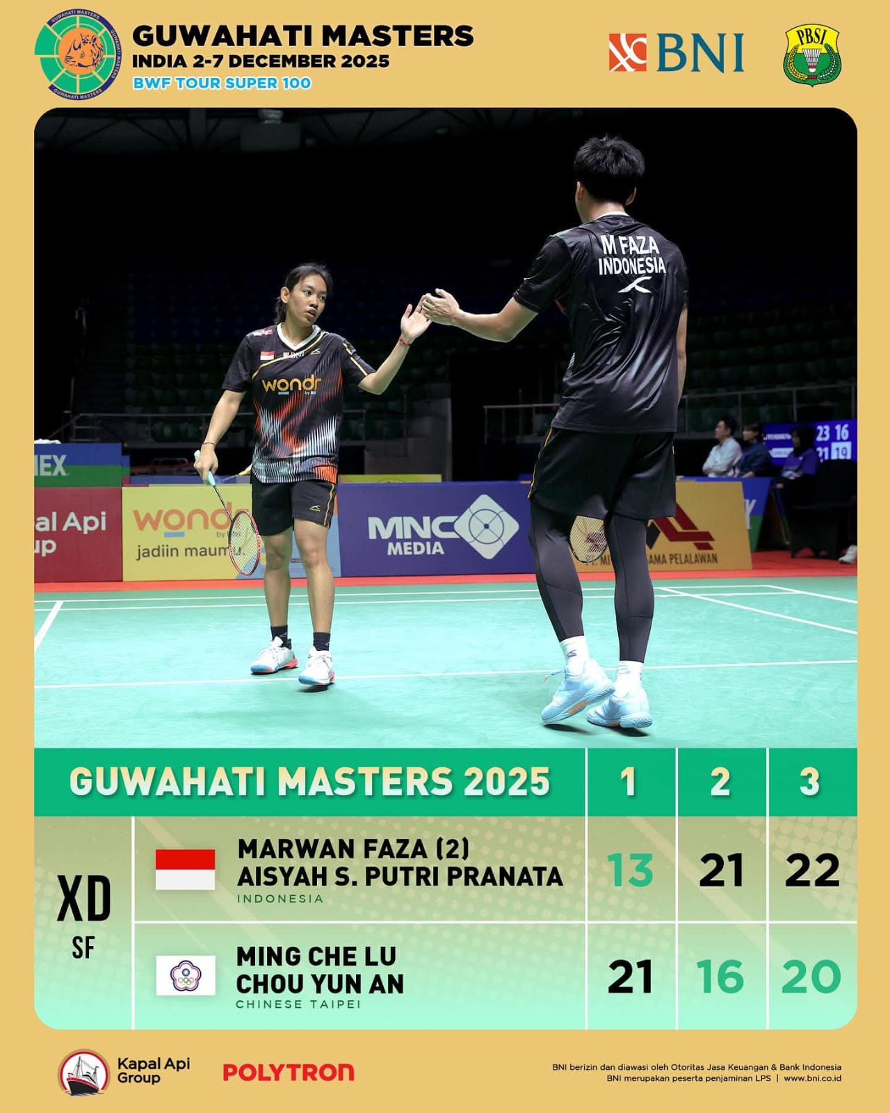 GUWAHATI (INDIA), Siberkreatif.com – Laga semifinal (sf) hari ini Sabtu (6/12/2025) mempertemukan satu-satunya sektor ganda campuran muda Indonesia Marwan Faza/Aisyah Salsabilah Putri Pranata melakoni laga sengit wakil ganda campuran terbaik Chinese Taipei (Taiwan).