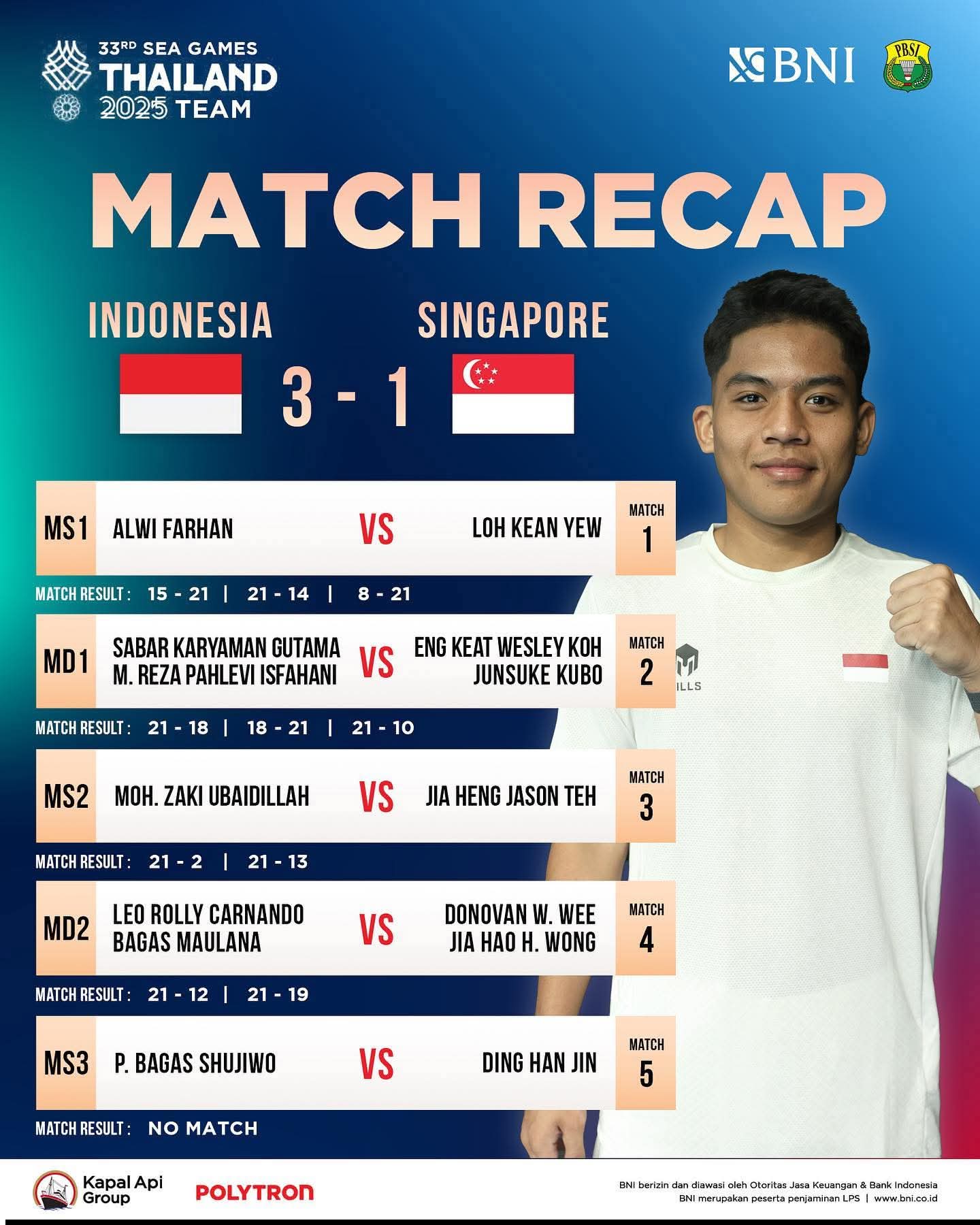 Di laga semifinal tadi, tim beregu putra badminton Indonesia di komandoi oleh sang kapten Sabar/Reza mampu menundukkan tim beregu putra singapore dengan skor 3-1.