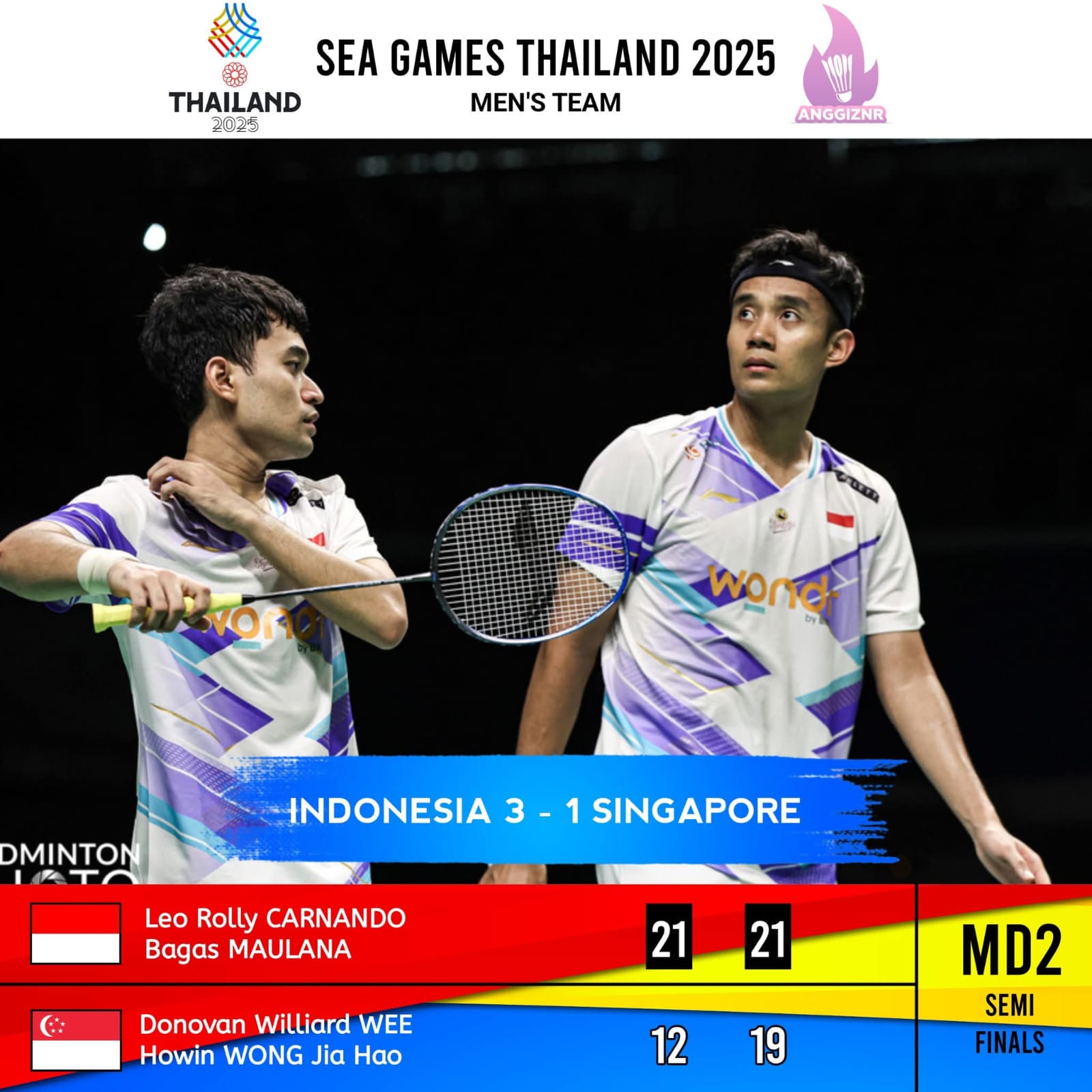 Kemudian, di laga partai ke-4 sektor ganda putra Bagas Maulana/Leo Carnando mampu menutup laga dengan poin kemenangan sehingga memastikan Indonesia berhasil melangkah ke laga pamungkas (final) besok Selasa (9/12/2025).