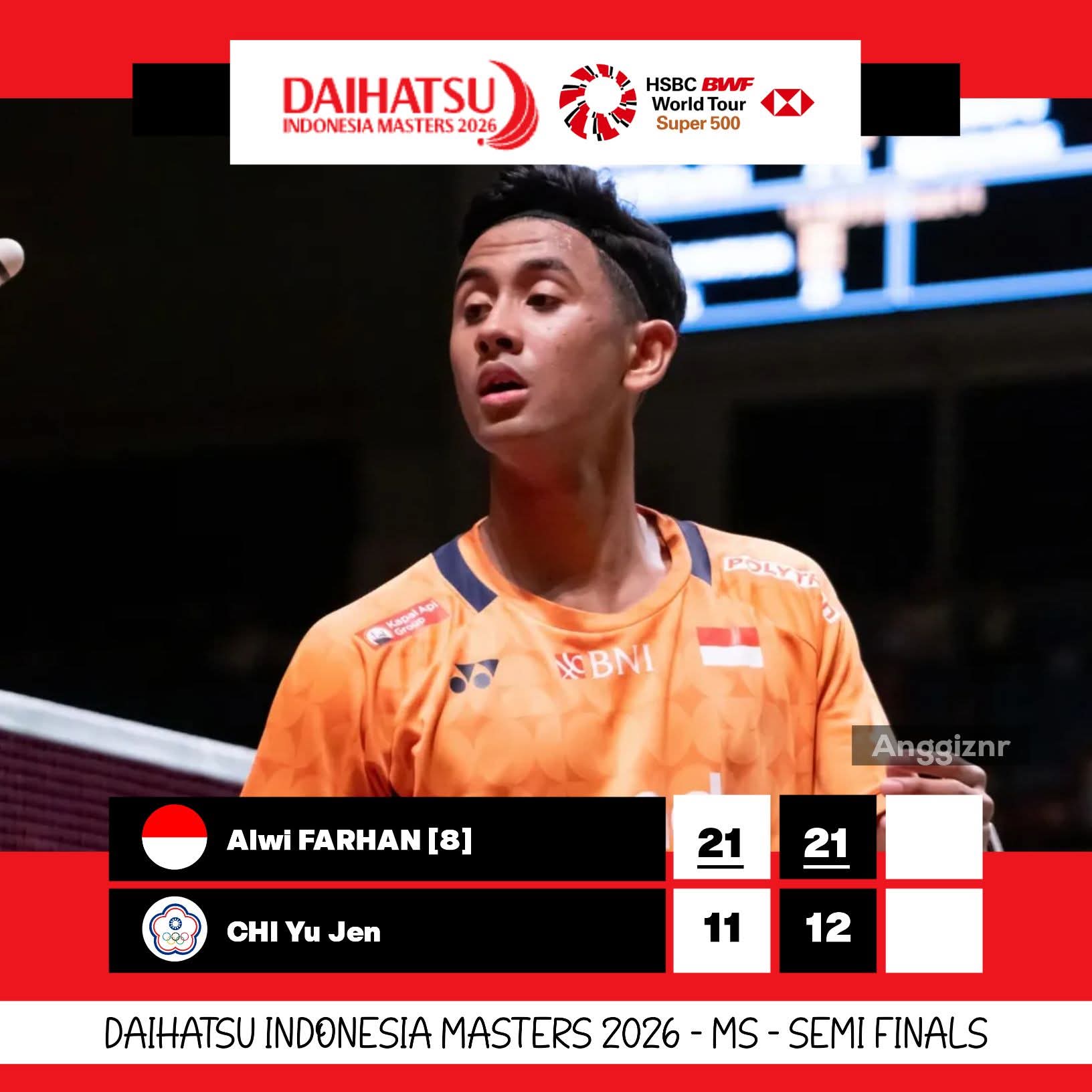 Di laga semifinal ini, Alwi Farhan sukses menumbangkan wakil terbaik tunggal putra Chinese Taipei (Taiwan) secara straight game (dua set) 21-11 dan 21-12.