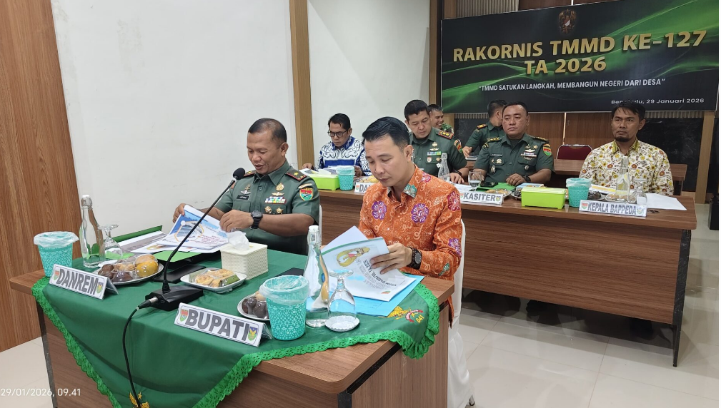 Rejang Lebong, siberkreatif.com – Bupati Rejang Lebong H. M. Fikri Thobari, S.E., M.A.P Bersama Ketua DPRD Juliansyah Yayan menghadiri dan mendampingi Komandan Korem (Danrem) 041/Garuda Emas (Gamas) Brigjen TNI Jatmiko Aryanto, S.E., M.Han. dalam kegiatan Rapat Koordinasi Teknis (Rakornis) TNI Manunggal Membangun Desa (TMMD) ke-127 Tahun Anggaran 2026, yang digelar di Makorem 041/Gamas, Bengkulu, Kamis (29/1/2026), pukul 08.30 WIB.