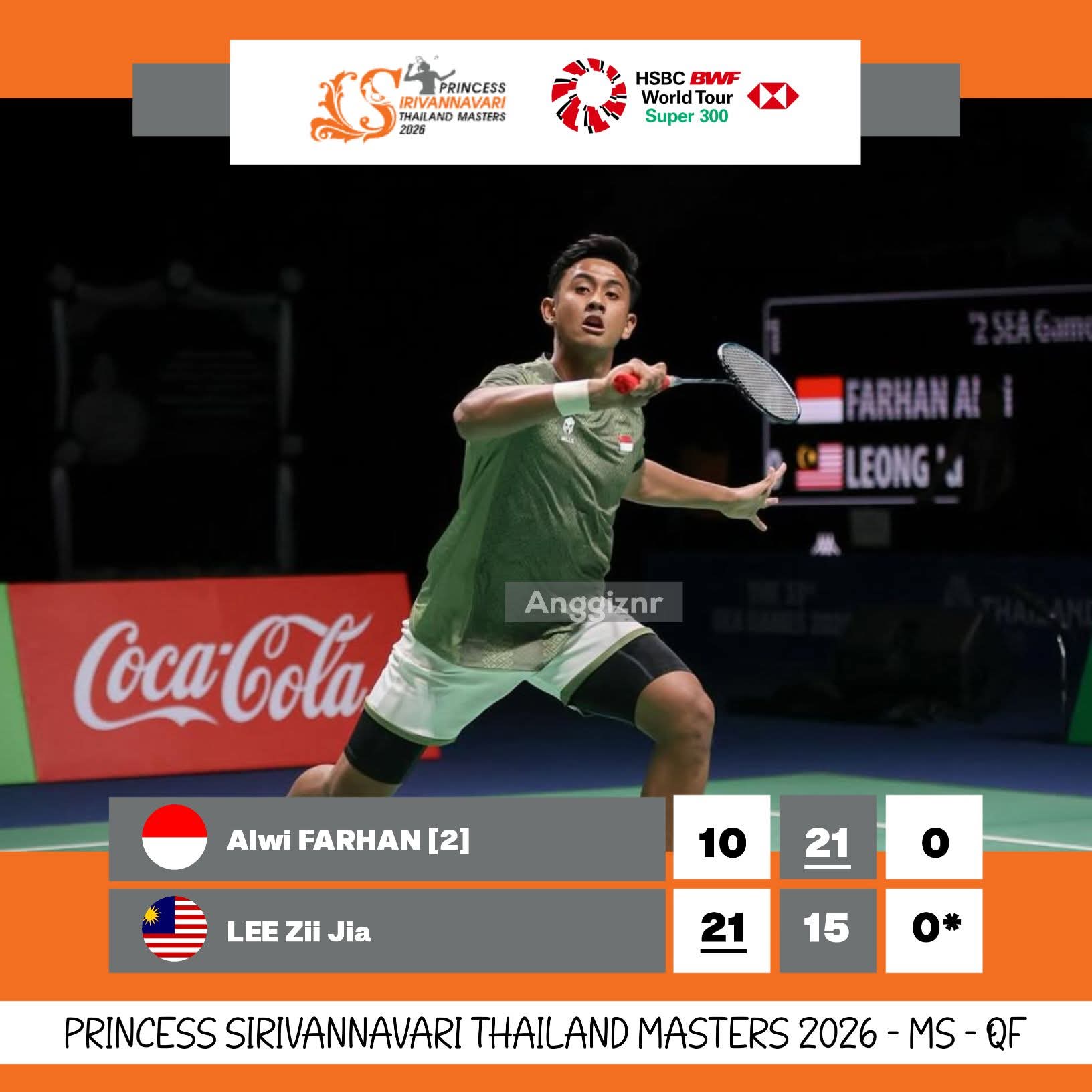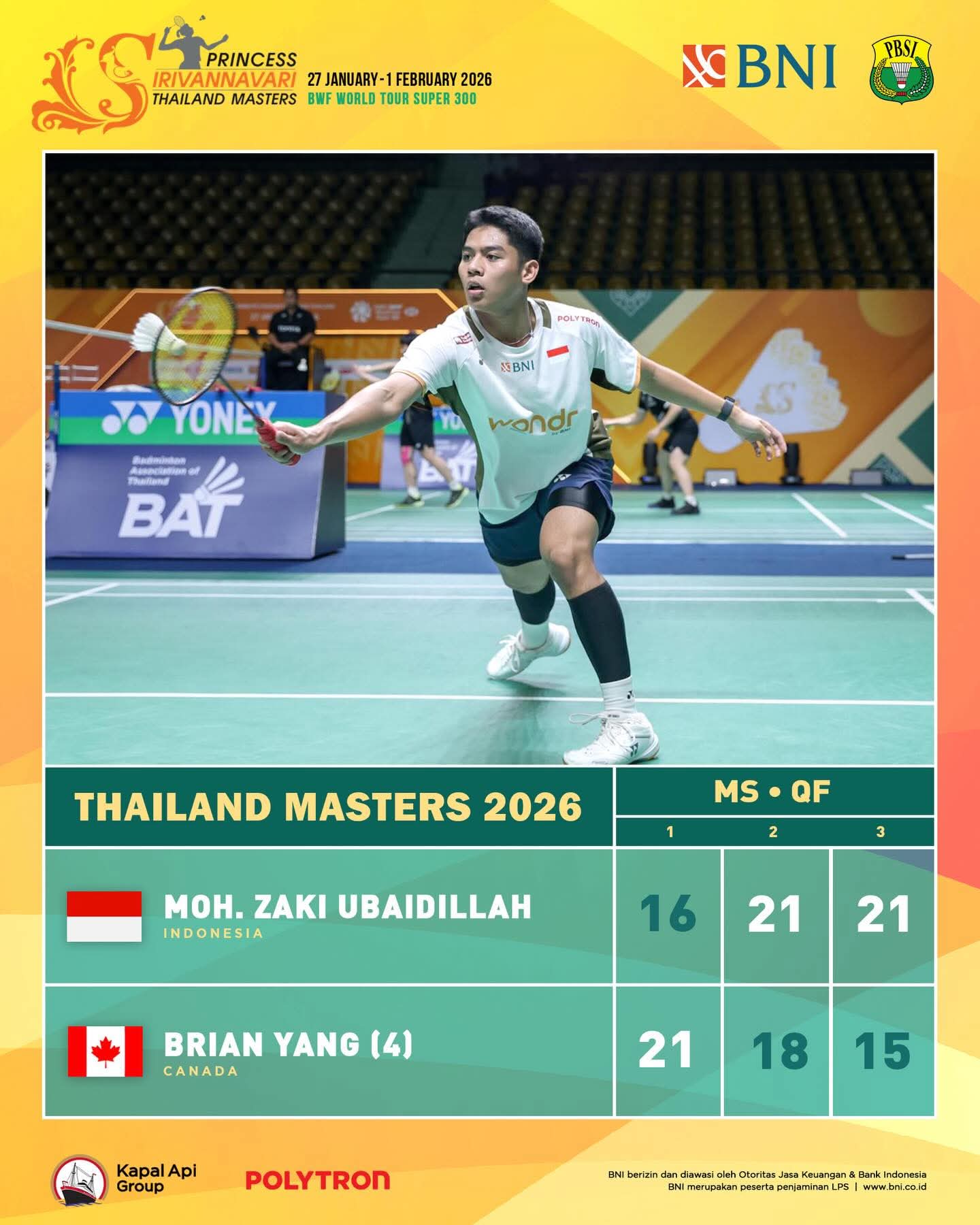 Di laga quarter final (qf) hari ini Jum’at (30/1/2026), sang anak muda Mohammad Zaki Ubaidillah alias Ubed sukses menumbangkan unggulan ke-4 asal Negara Kanada Brian Yang dan Alwi Farhan sukses menundukkan tunggal putra senior Negeri Jiran (Malaysia).