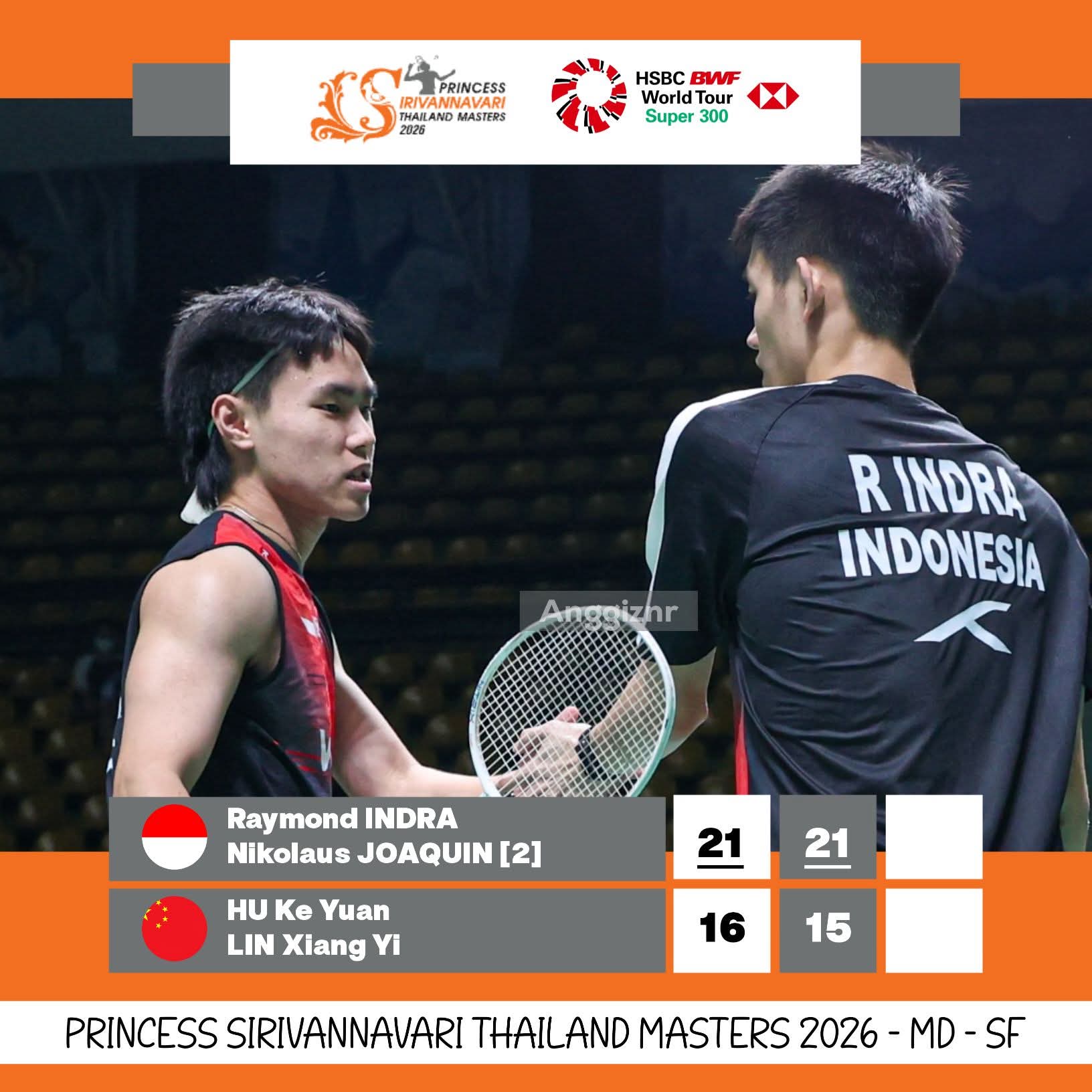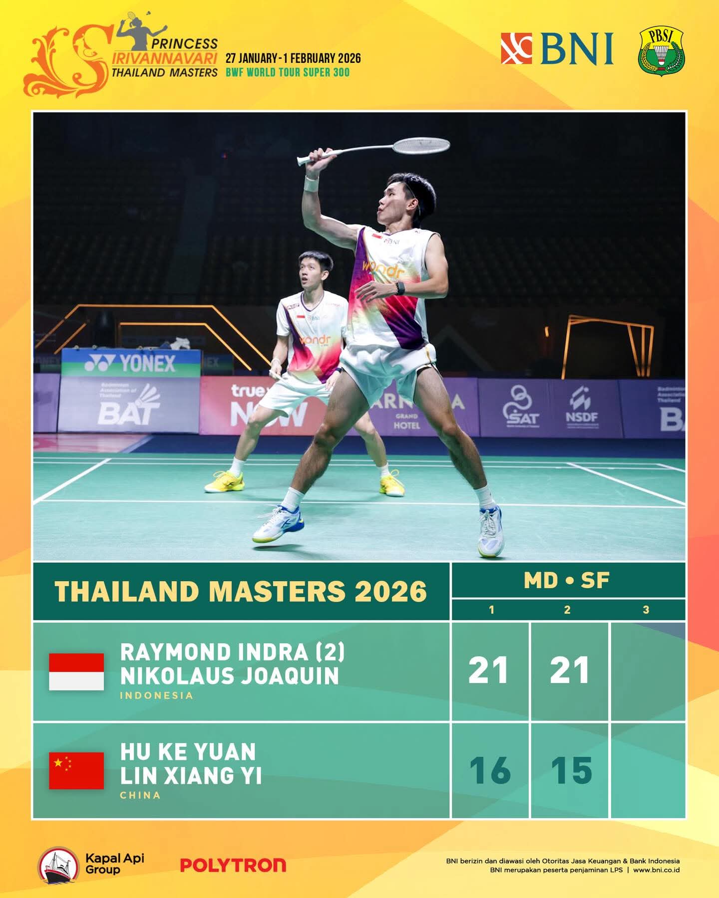 Hal ini setelah pasangan muda ganda putra Indonesia Raymond Indra/Nikolaus Joaquin berhasil menumbangkan ganda putra terbaik China secara straight game (dua set) 21-16 dan 21-15.