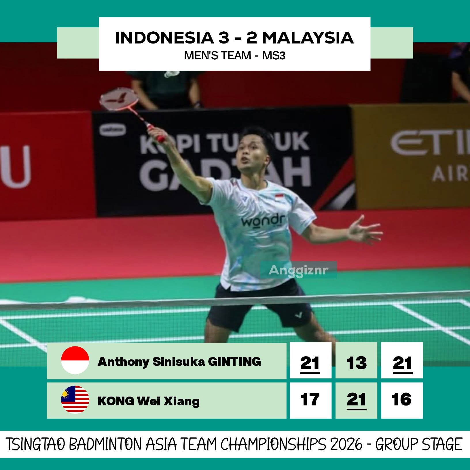 Terakhir, lewat tunggal ke-3 Indonesia Anthony Sinisuka Ginting pemain sangat senior di sektor tunggal putra ini, akhirnya bisa menutup laga dengan kemenangan walau harus susah penuh dengan perjuangan ditentukan hingga laga set penentu (set ke-3).